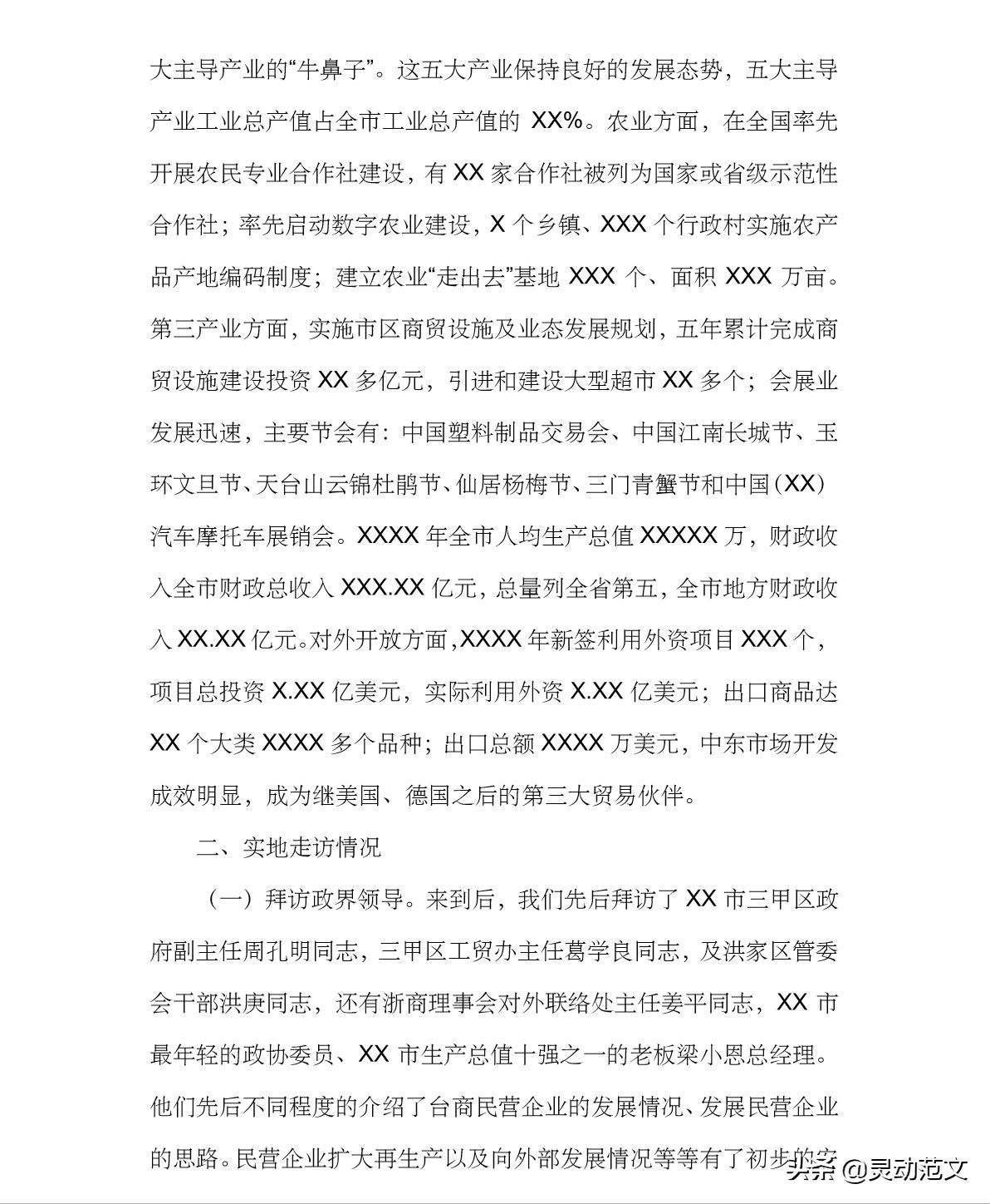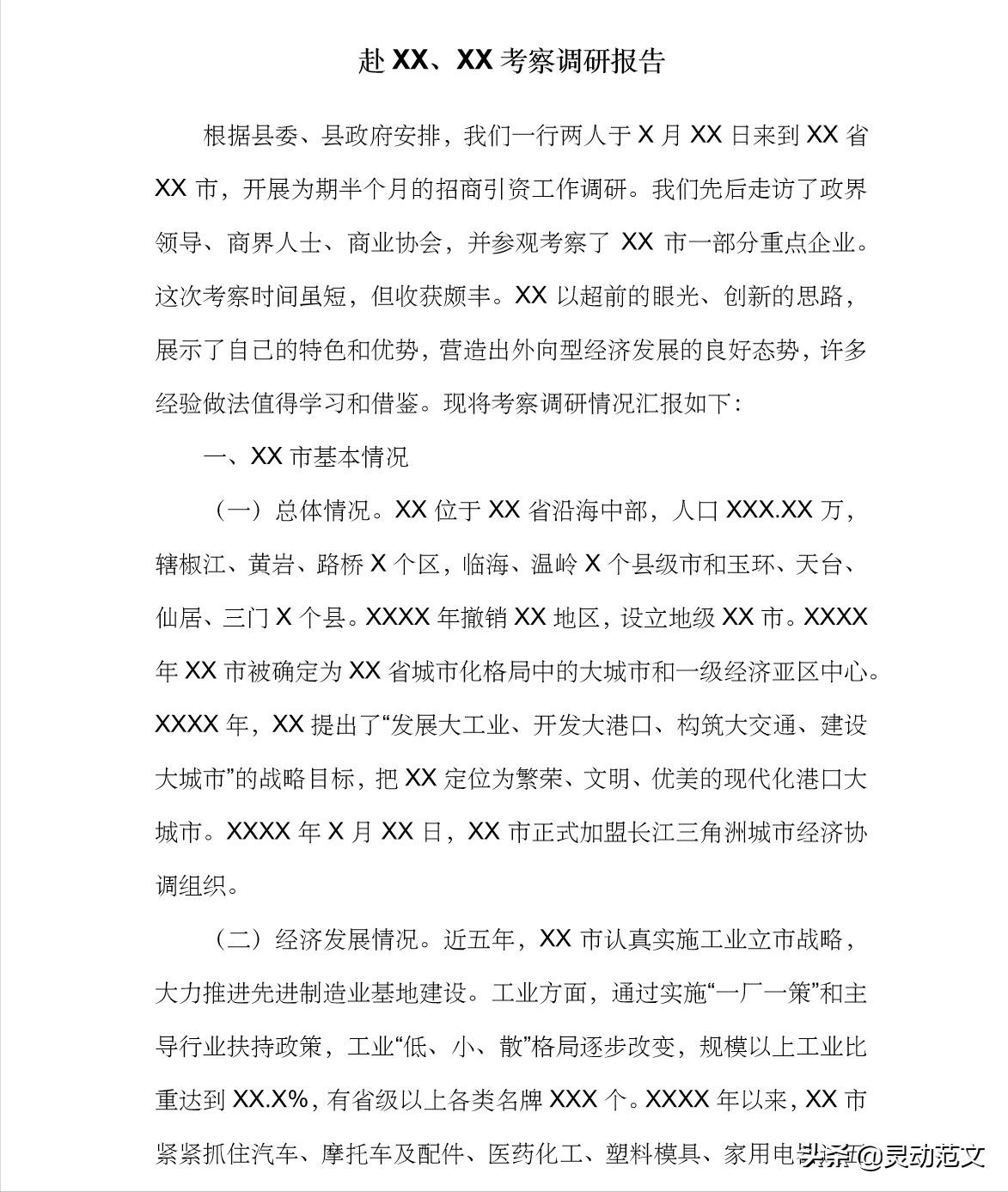 根据某安排,某人于时间来到某地,开展XX工作调研。我们先后走访了地点并参观考察了地点。这次考察时间虽短,但收获颇丰。XX以超前的眼光、创新的思路,展示了自己的特色和优势,营造出外向型经济发展的良好态势,许多经验做法值得学习和借鉴。现将考察调研情况汇报如下: