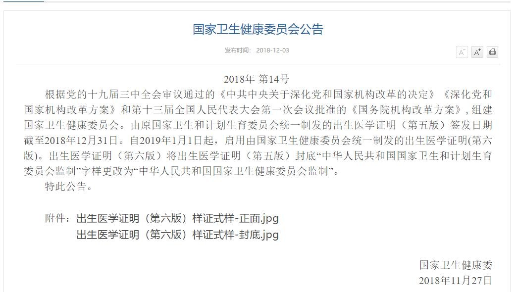 国家卫生健康委员会今天(3日)发布公告,由原国家卫生和计划生育委员会统一制发的出生医学证明(第五版)签发日期截至2018年12月31日。自2019年1月1日起,启用由国家卫生健康委员会统一制发的出生医学证明(第六版)。出生医学证明(第六版)将出生医学证明(第五版)封底“中华人民共和国国家卫生和计划生育委员会监制”字样更改为“中华人民共和国国家卫生健康委员会监制”。