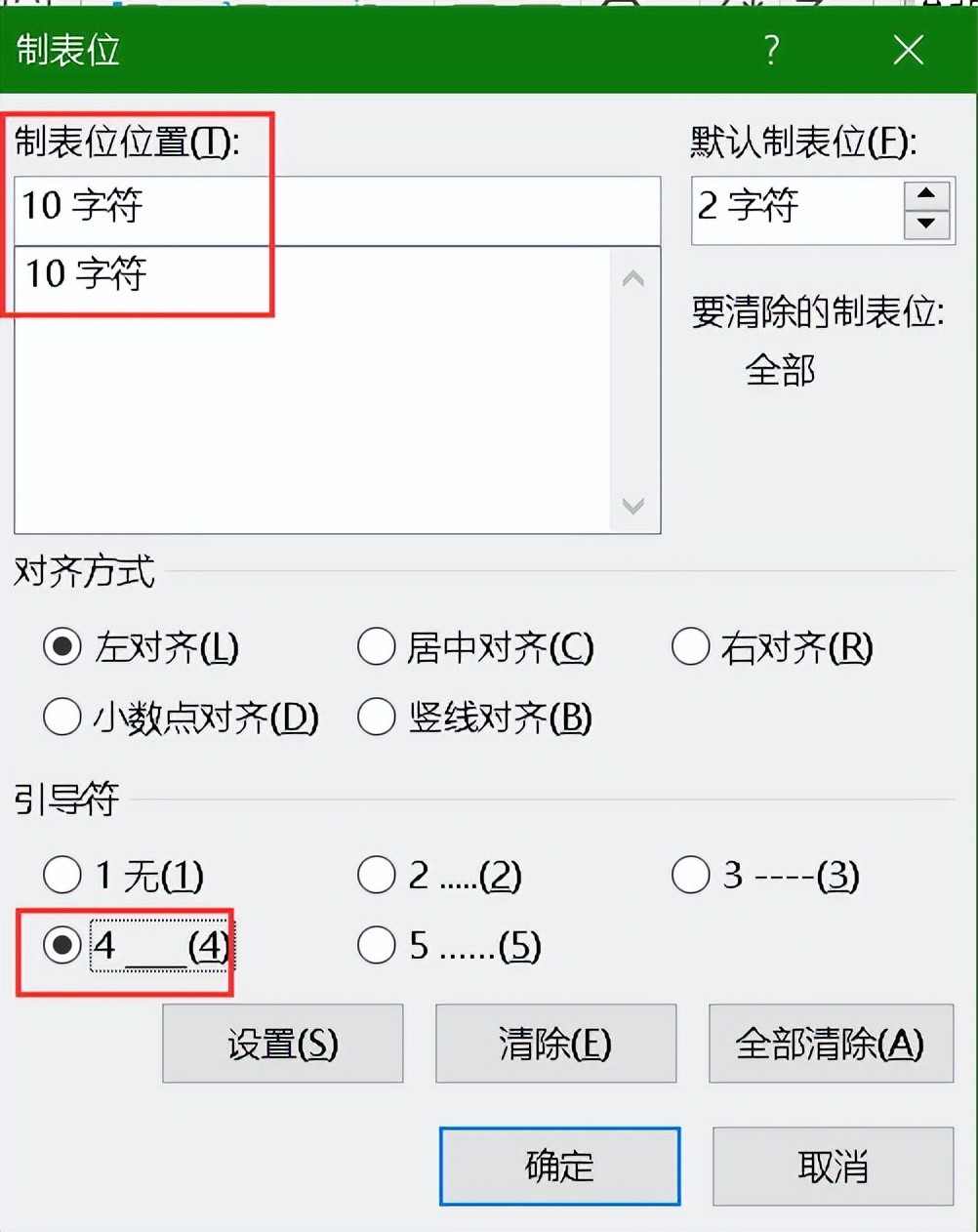 打开制表位窗口,在制表位位置输入框里输入横线的长度,点击下方的“设置”,引导符勾选“横线”,点击确定。