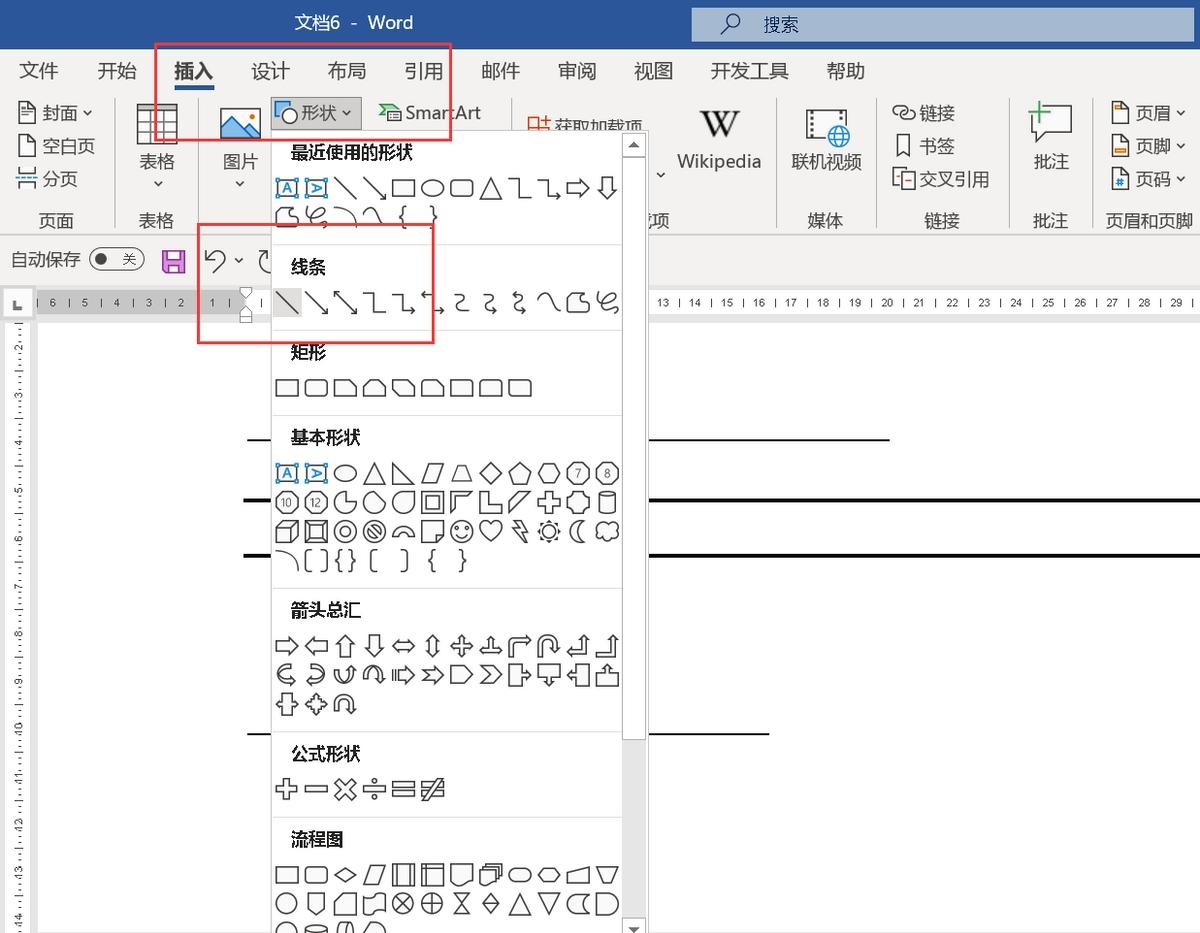 点击菜单栏上“开始-插入-形状”,下拉选择“横线”。