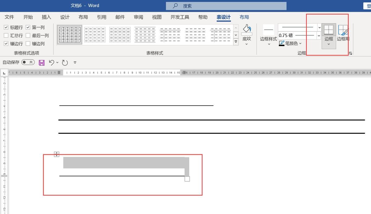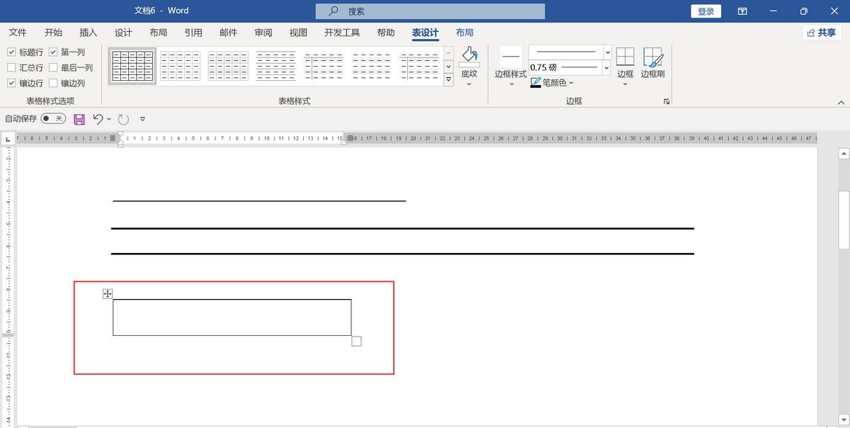 文档里插入了一个格子的表格,选中表格,移动鼠标,可以调整表格的大小,点击功能区“表设计-边框”。