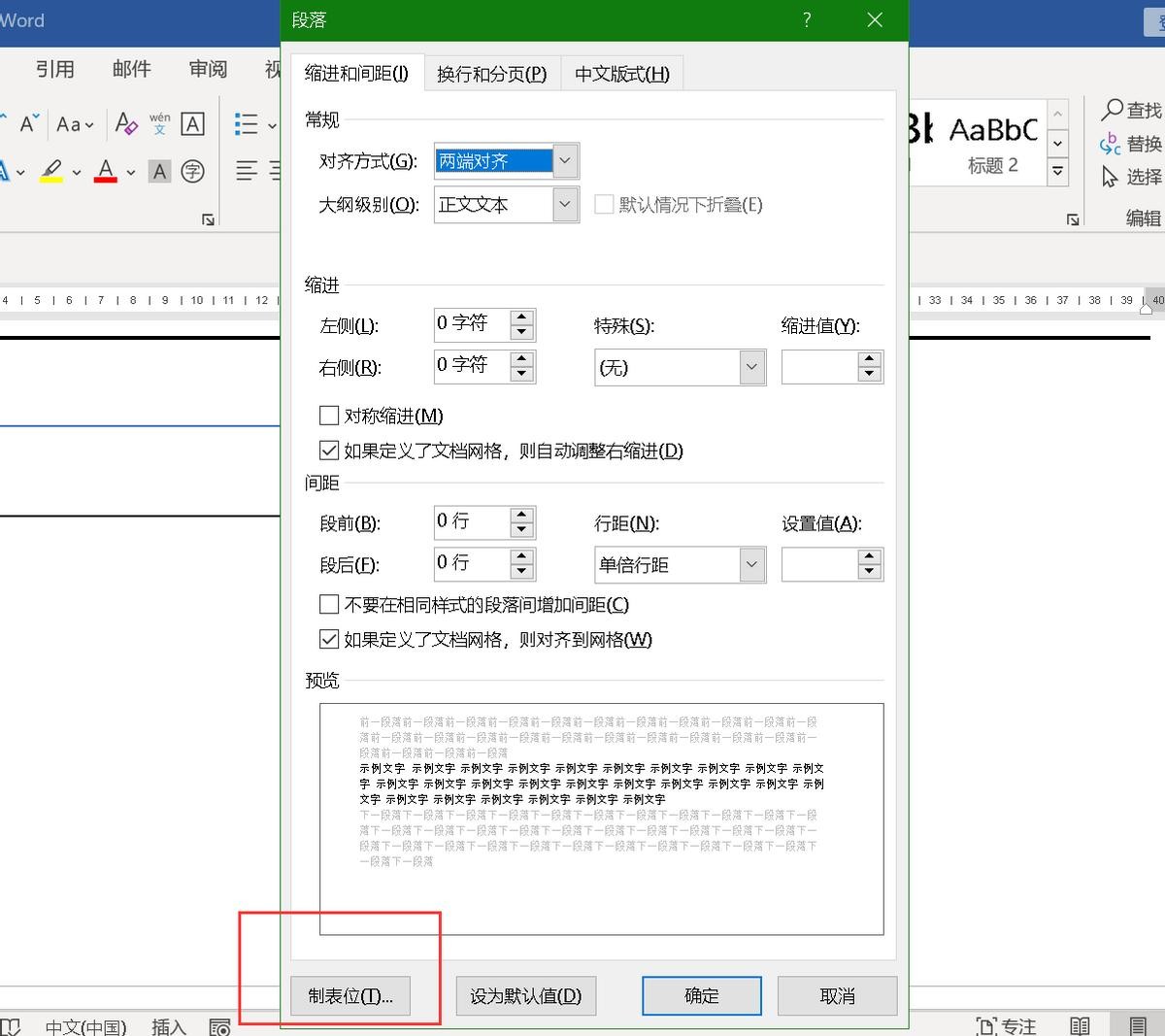 打开文档里的段落设置窗口,点击左下角的“制表位”。