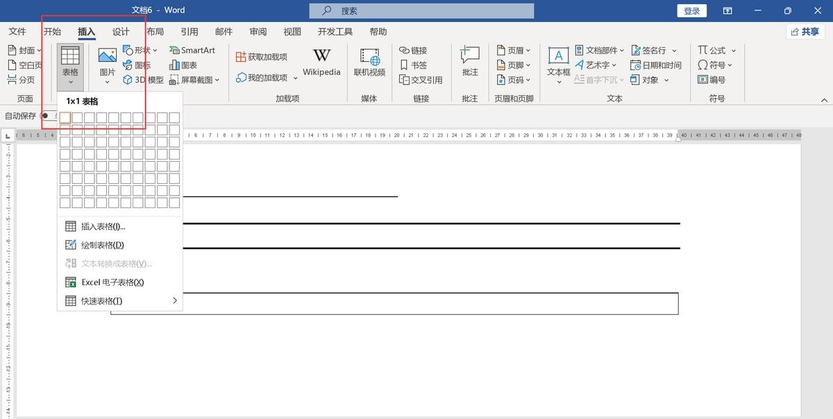 在WORD文档里,点击菜单栏上“插入-表格”,下拉选择“1X1”表格。