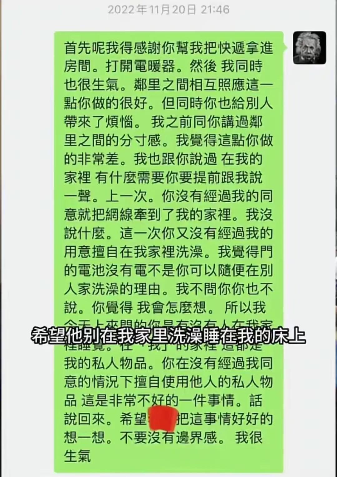 不过,邻居大哥在离开后,给他发了千字长文,解释了自己住在他家的原因: