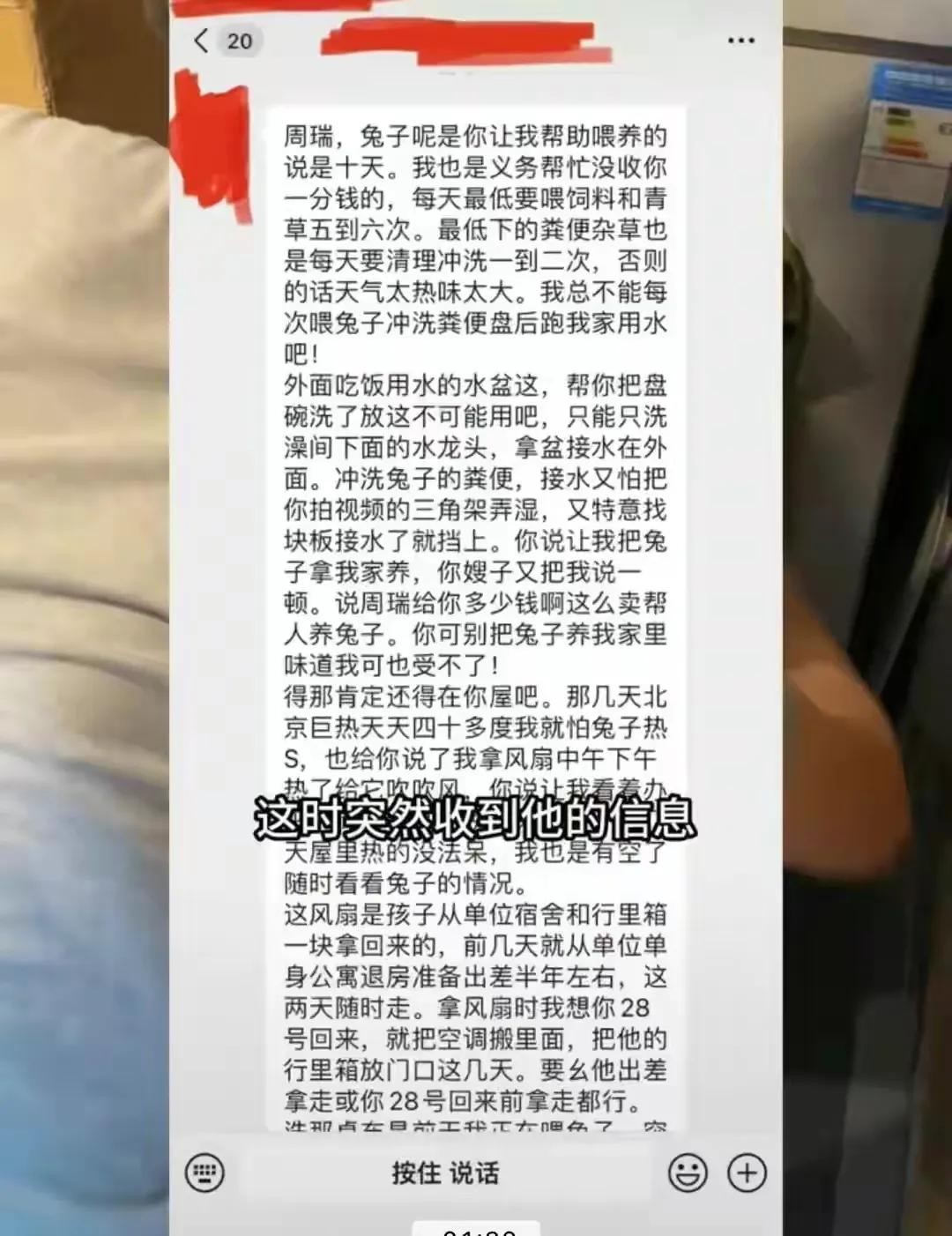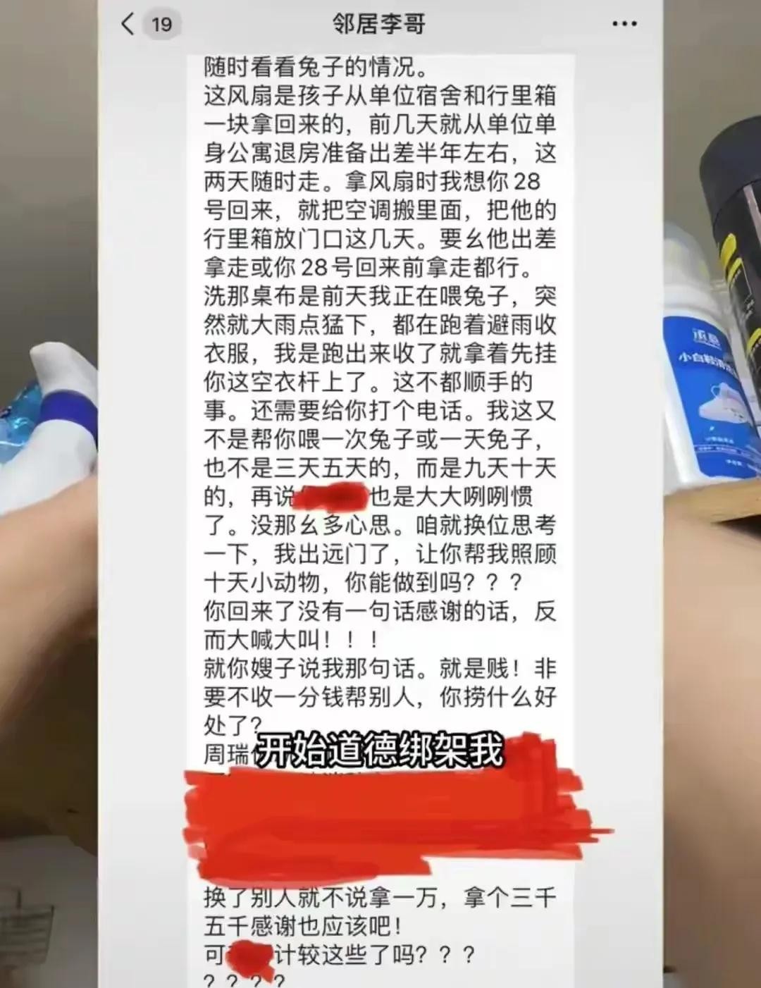 据周瑞称,自己原本只是让邻居大哥帮忙照顾几天小兔子,没想到,邻居却毫无边界感,直接拿着自己的两大箱行李就住了进来。