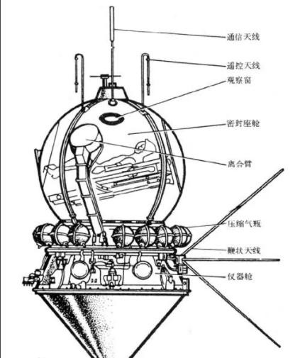 “东方”号载人飞船由球形密封座舱和圆柱形仪器舱组成,重约4.73吨,全长7.35米,球形的座舱是航天员乘坐的地方,其直径有2.3米,能乘坐1名航天员。在舱壁上设有3个舷窗,可以由此观察宇宙空间和地球。舱外表面覆盖了一层防热物质材料。舱内携带的氧气、食品和电力储备,可供10昼夜的飞行。在返回地球时,“东方”号的座舱与仪器舱分离,座舱单独再入大气层返回地球。