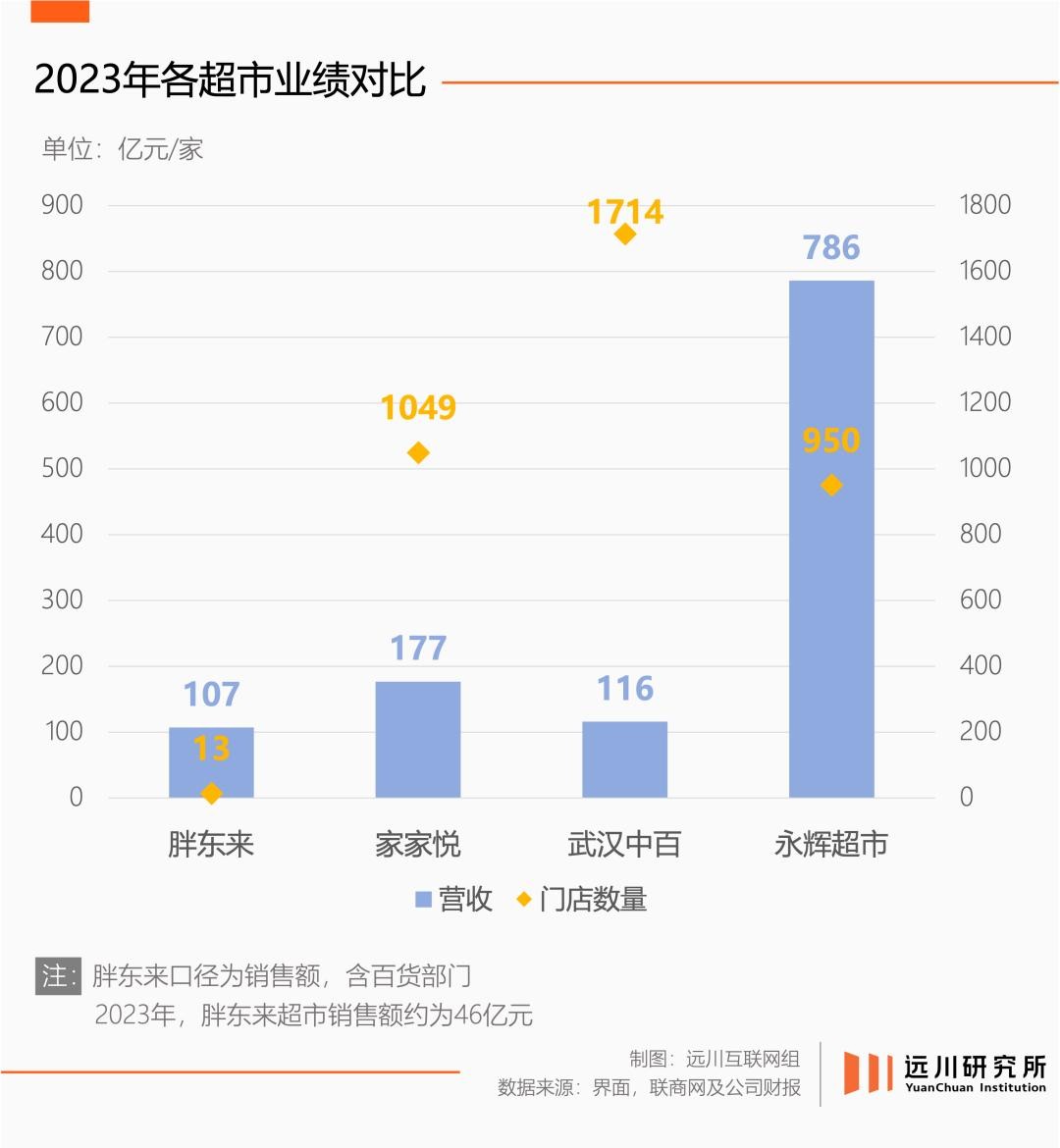 胖东来从来不是一家大公司,按照天使城超市店长刘改敏的口径,2023年胖东来年销售额约为107亿元(于东来口径146亿),其中超市贡献了46亿元[9]。这个数字不仅远低于中百、永辉等学生,甚至不如盒马。