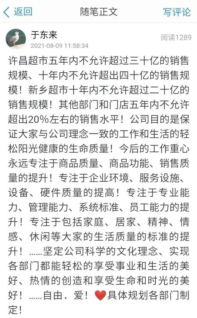 这种警惕在多年前早有伏笔。2003年,胖东来开出第一家大型综合超市不到两年,于东来在给员工的内部信里写道: