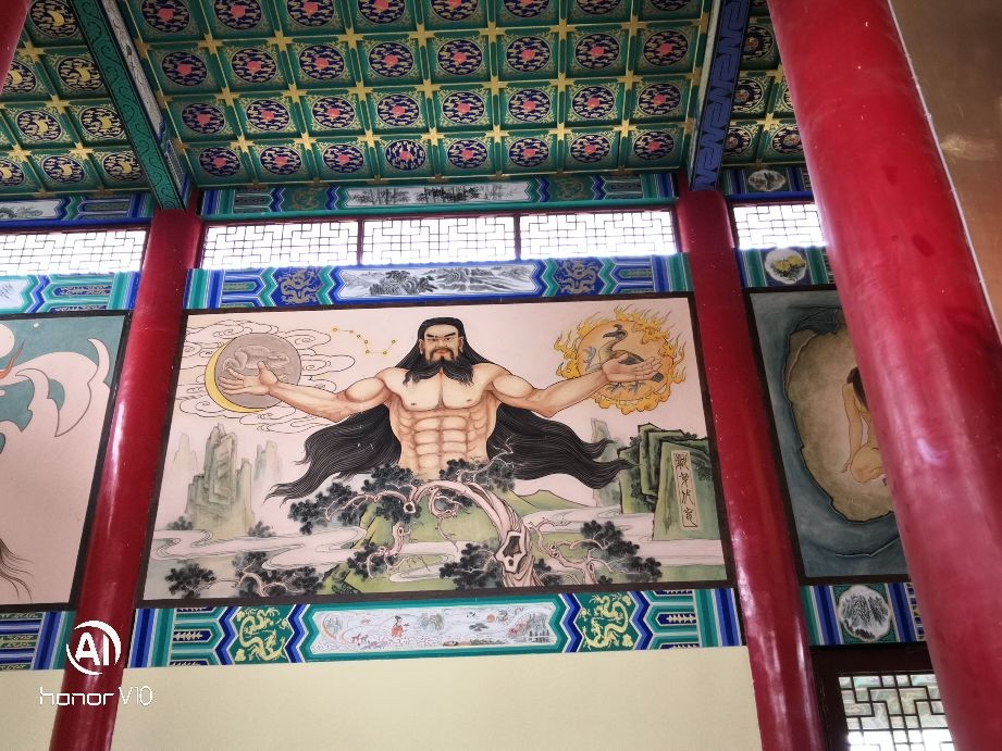 殿内墙壁四周是女娲创世和盘古开天劈地文化壁画,用图画的方式讲述了女娲抟土造人和盘古开启混沌的神话传说。画面精美,形象逼真,栩栩如生。