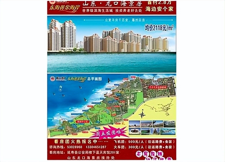 晚上,我们到达酒店入住,但心里早已被购房的念头占据。第二天一早,导游再次带领我们游览龙口的景点,但很快就转变话题,开始介绍海景房。一张楼盘宣传单,上面写着“海景房,均价2118元/平米”,如同一颗种子在我们心里生根发芽。