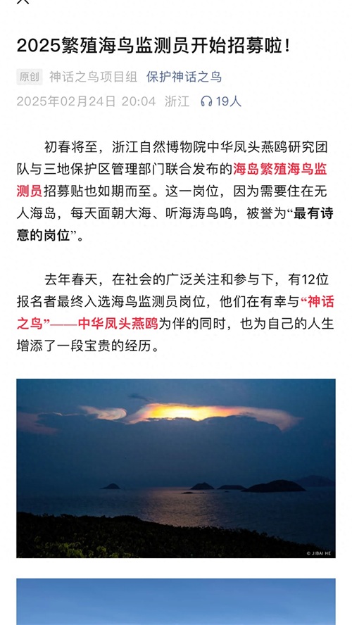 近日,浙江自然博物院中华凤头燕鸥研究团队与三地保护区管理部门联合发布海岛繁殖海鸟监测员招募公告。