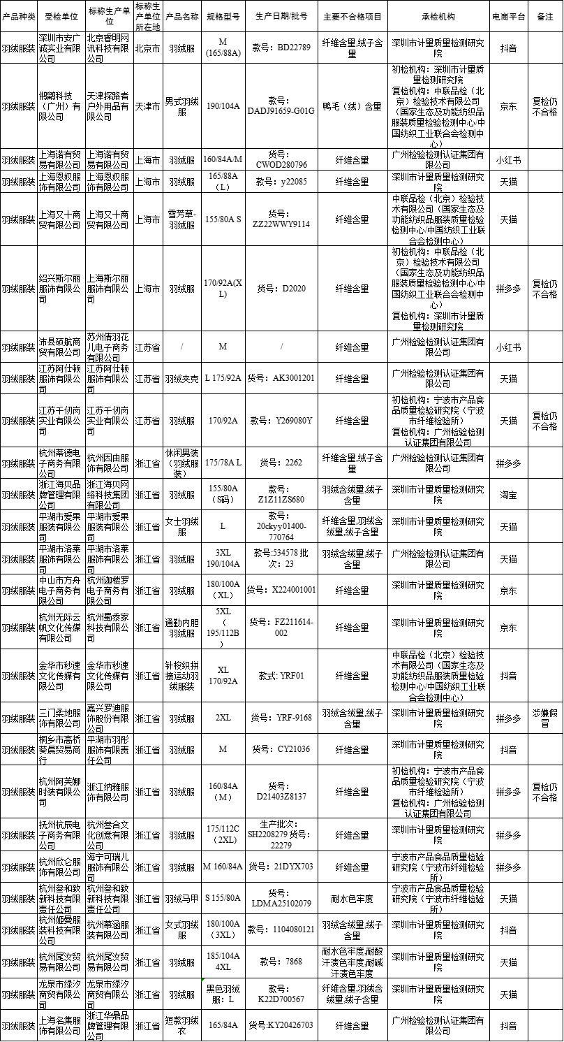 1. 标称生产单位北京睿明网讯科技有限公司生产的羽绒服,款号:BD22789,主要不合格项目:纤维含量,绒子含量;