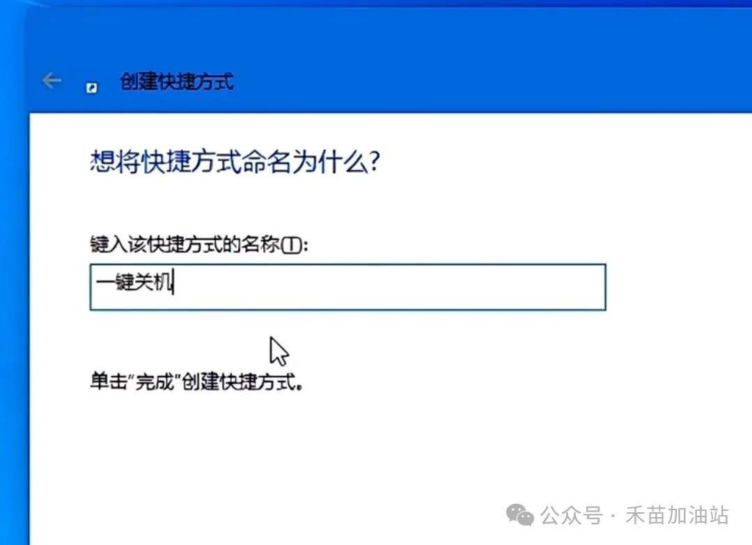 输入完指令后,点击“下一步”按钮。这时,会弹出一个对话框,要求我们为这个快捷方式输入一个名称。你可以根据自己的喜好来命名,比如“一键关机”。输入完名称后,点击“完成”按钮。