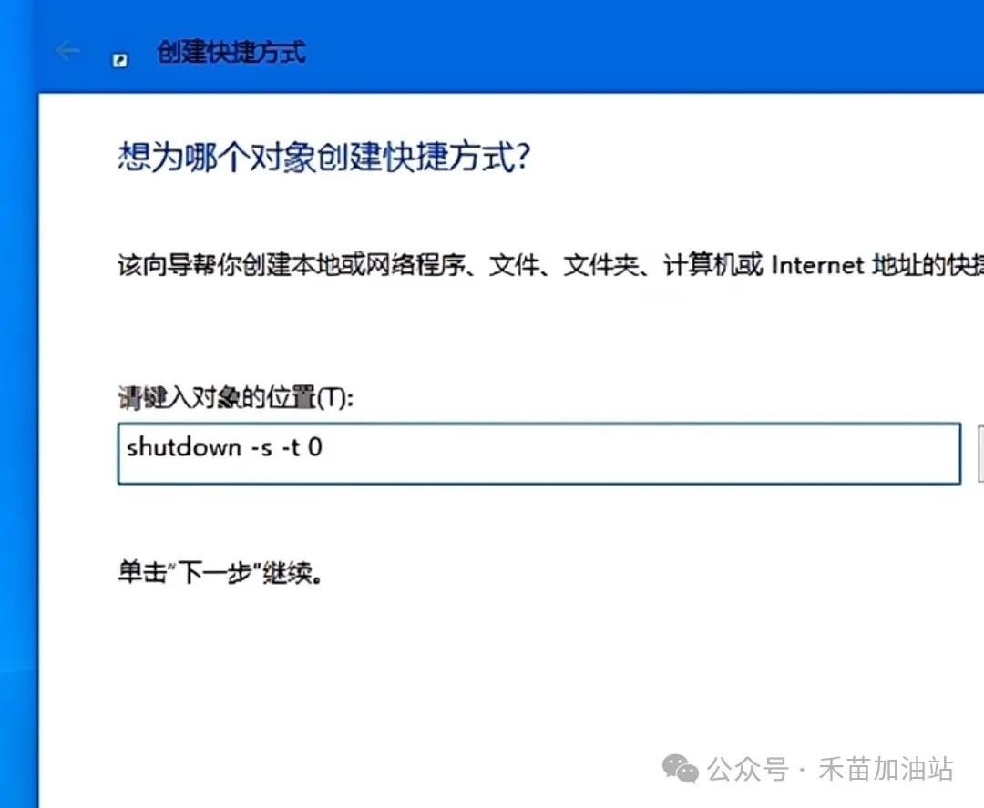 接下来,会弹出一个对话框,要求我们输入对象的位置。在这个位置中,我们需要输入一个特定的指令来实现关机功能。这个指令是“shutdown”,但为了确保关机操作能够顺利执行,我们还需要在这个指令后面添加一些参数。
