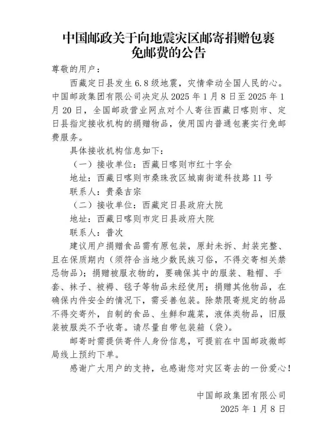 要为西藏地震灾区寄包裹献爱心的您,可以通过中国邮政邮寄。近日,中国邮政集团有限公司发出公告,从2025年1月8日至2025年1月20日,全国邮政营业网点对个人寄往西藏日喀则市、定日县指定接收机构的捐赠物品,使用国内普通包裹实行免邮费服务。