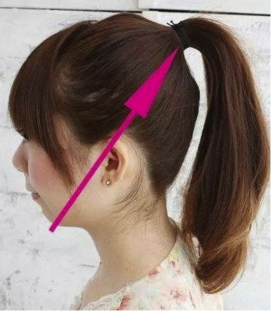 1、首先,先把头发扎成一个普通的高马尾,可以扎高一点,像图中显示的这样,在耳朵斜上方的延长线上。