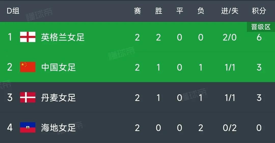 D组前两轮结束,英格兰6分暂居第1,中国和丹麦女足3分,海地女足0分第4!