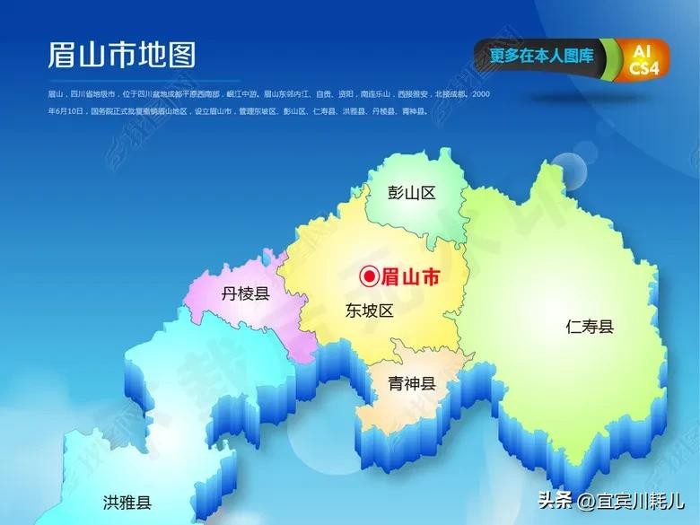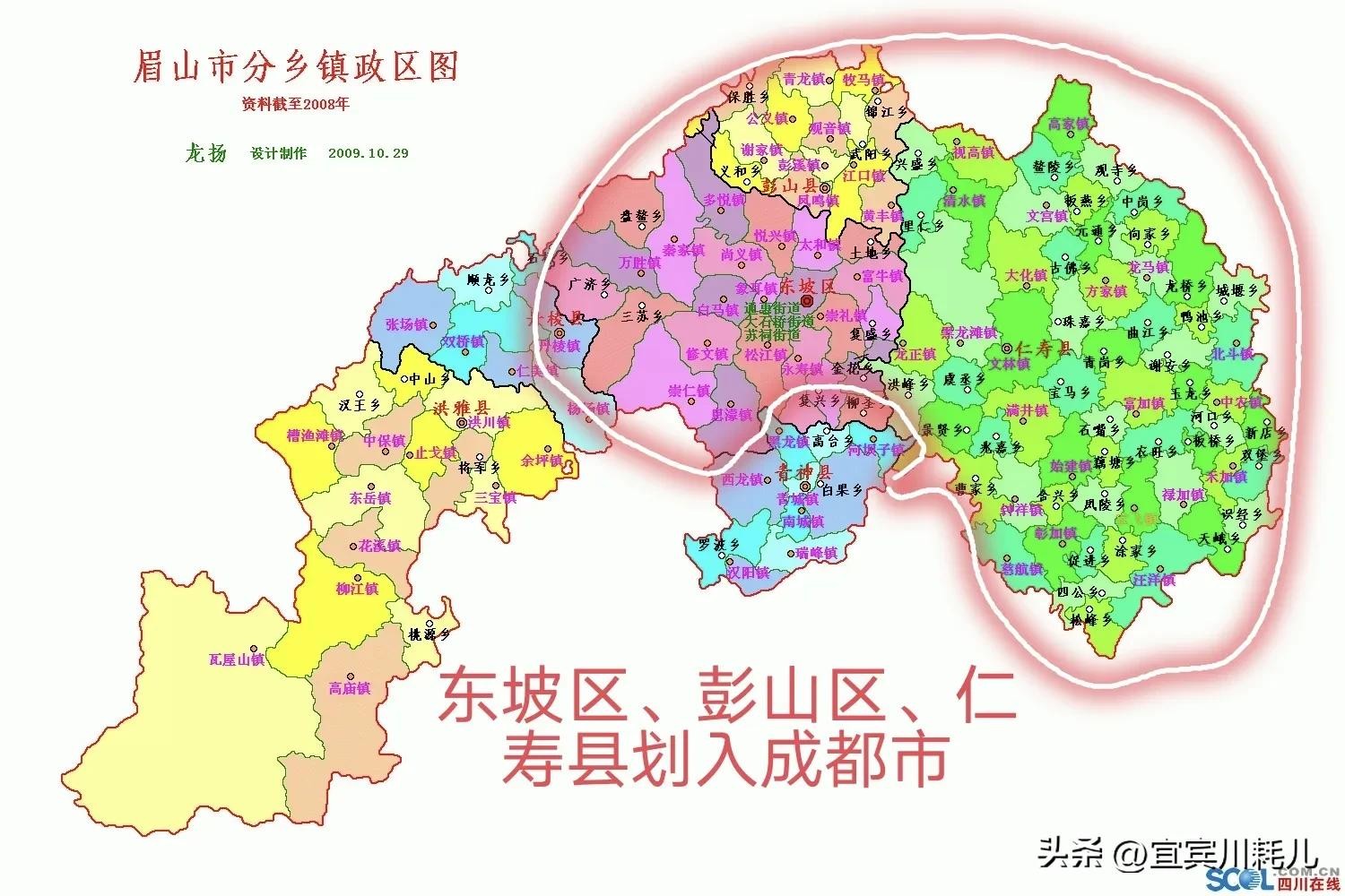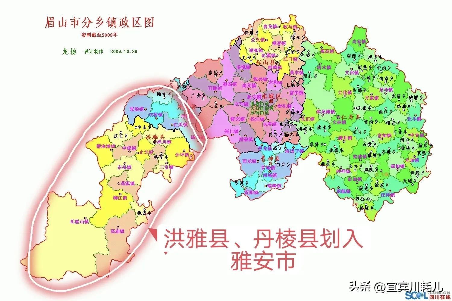二、拆分眉山市,将东坡区、彭山区、仁寿县划入成都市;洪雅县、丹棱县划入雅安市;青神县划入乐山市。