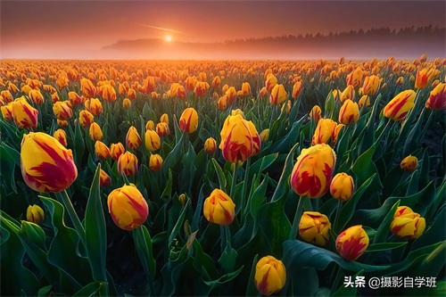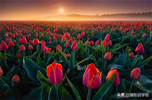 可以在日出或者日落前后30分钟之内拍摄,因为这个时间段内,光线更加柔和,色彩更加漂亮。如果是像上图与下图这样,一片花朵,那在选择恰当的时间之后,还要注意水平线不要弯,保证水平线是平的是直的。