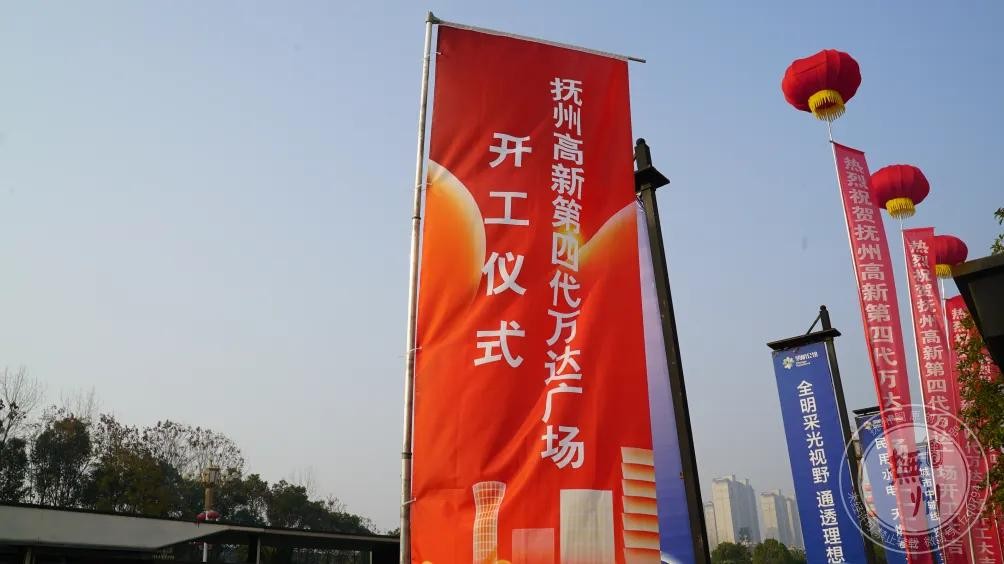 旁侧道旗、条幅上书“抚州高新第四代万达广场开工仪式”随风飘扬,仿佛在向抚州人告知这个好消息,现场一片喜庆欢腾。