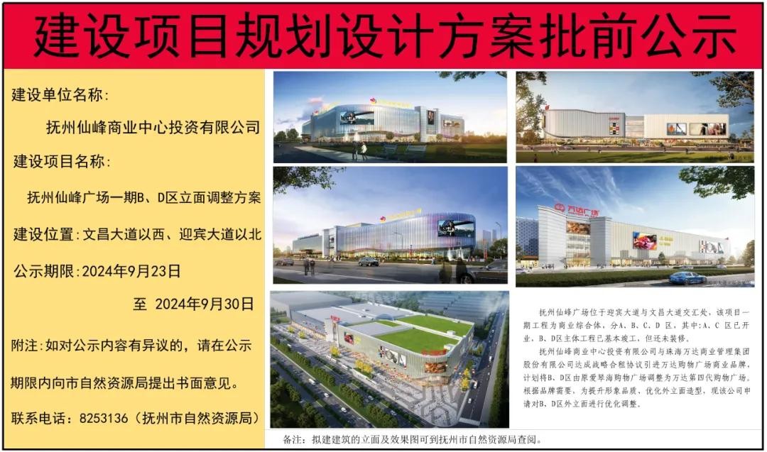 其实早在2024年6月份圈圈便听闻“第四代万达入驻抚州”的消息,一度引起广大市民关注,同年9月抚州市自然资源局发布了《抚州仙峰广场一期B、D区立面调整方案批前公示》,明确提到万达第四代购物广场将入驻抚州仙峰广场,使得这一消息得到证实。