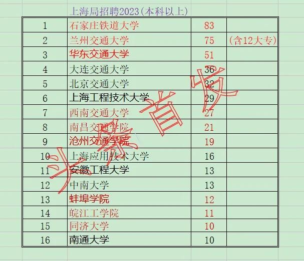 3.3假如今年上海局招聘人数真能达到(4000+2000)=6000人,那么这些本科院校和专科院校招聘人数会增加至2023年录取人数的1.5倍以上,比如“石家庄铁道大学”上海局招聘人数约为83x1.5=125人;“南京铁道职业技术学院”上海局招聘人数约为625x1.5=968人;其他院校依此类推,进入上海局情况,今年比去年就业形势相对乐观!